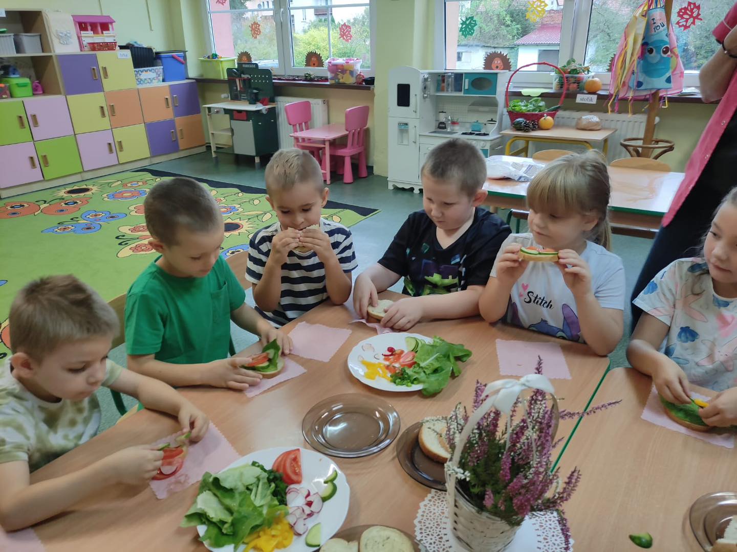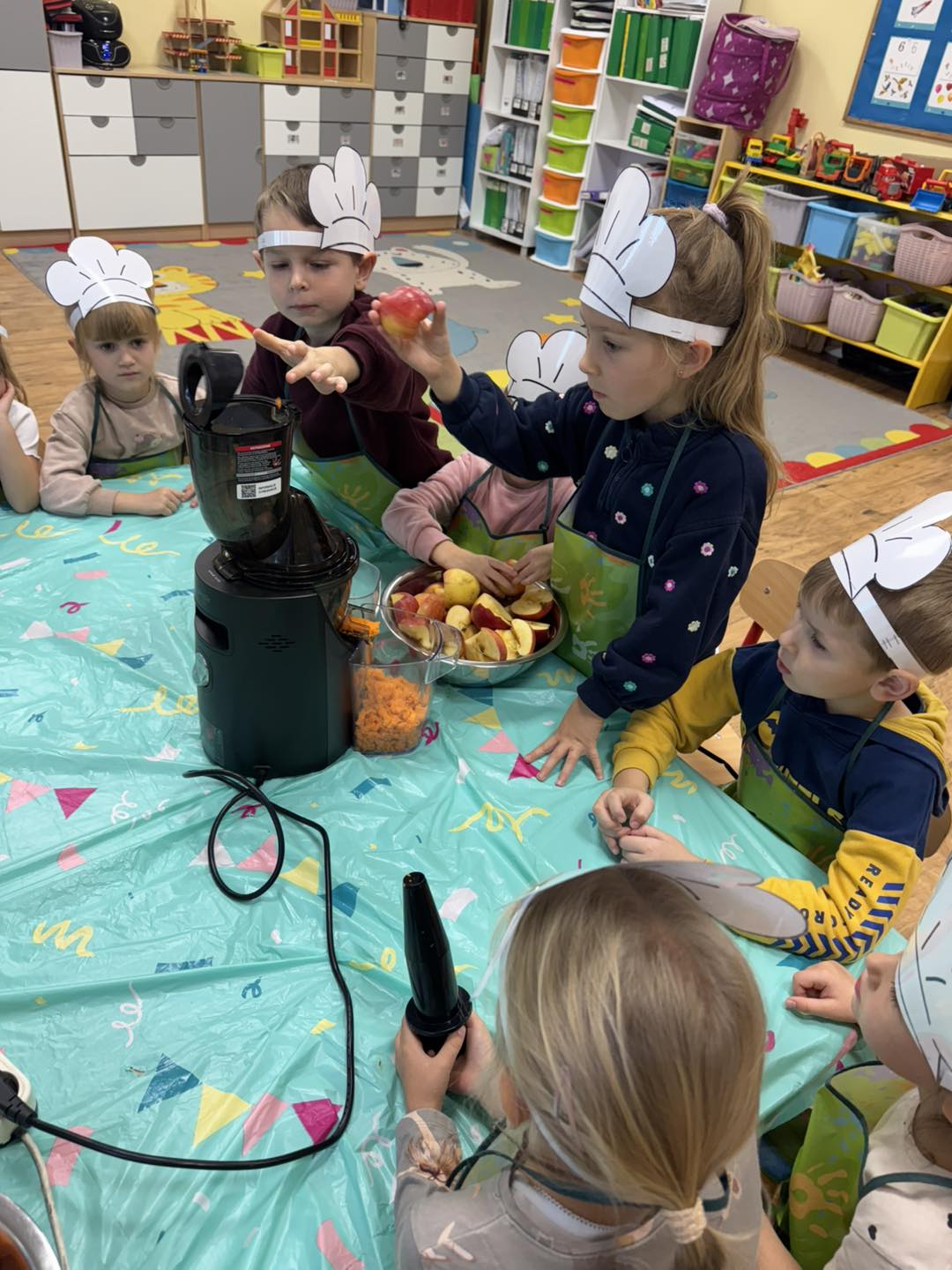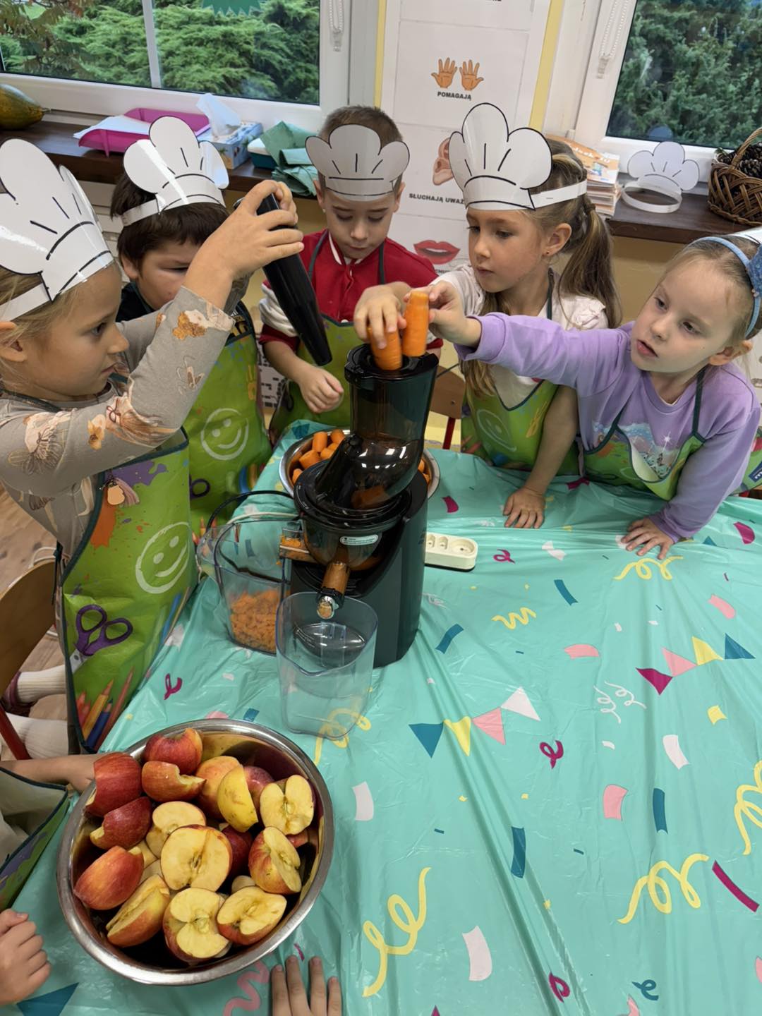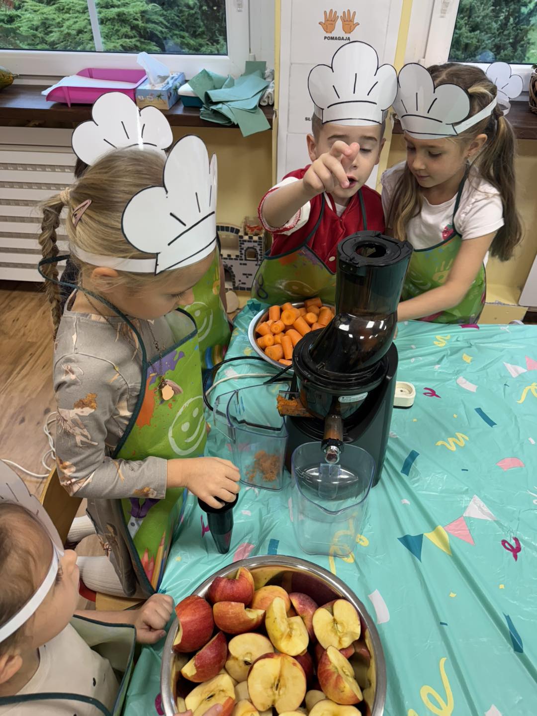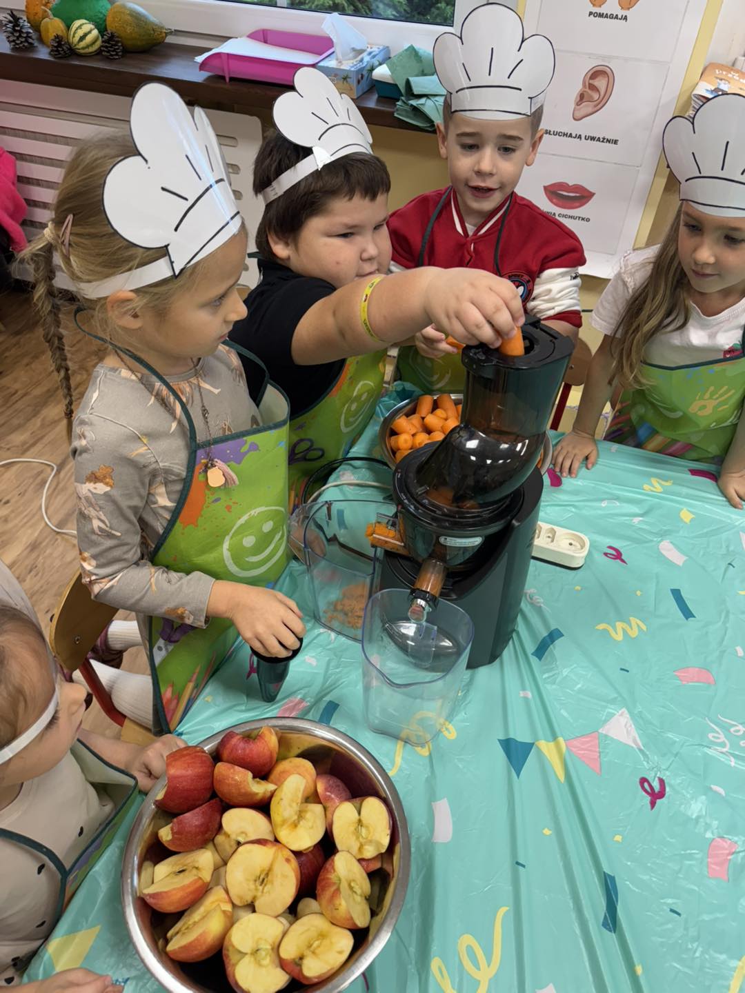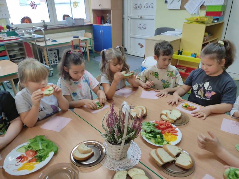 Dzieci 6- letnie wzięły aktywny udział w warsztatach kulinarnych. Samodzielnie komponowały kanapki z warzyw według własnego uznania. Były kolorowe i pyszne! Natomiast 5-latki przygotowały pyszny, zdrowy sok jabłkowo-marchewkowy.