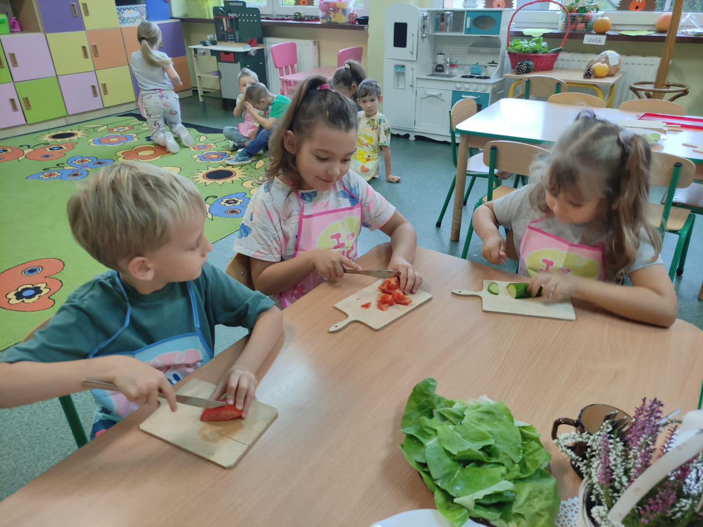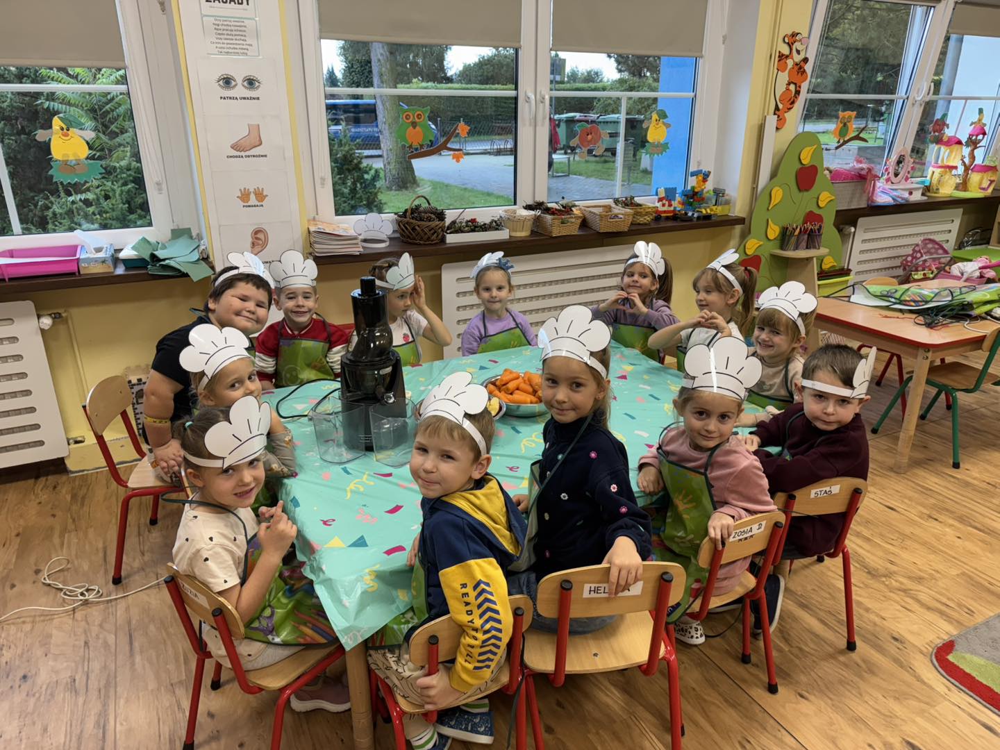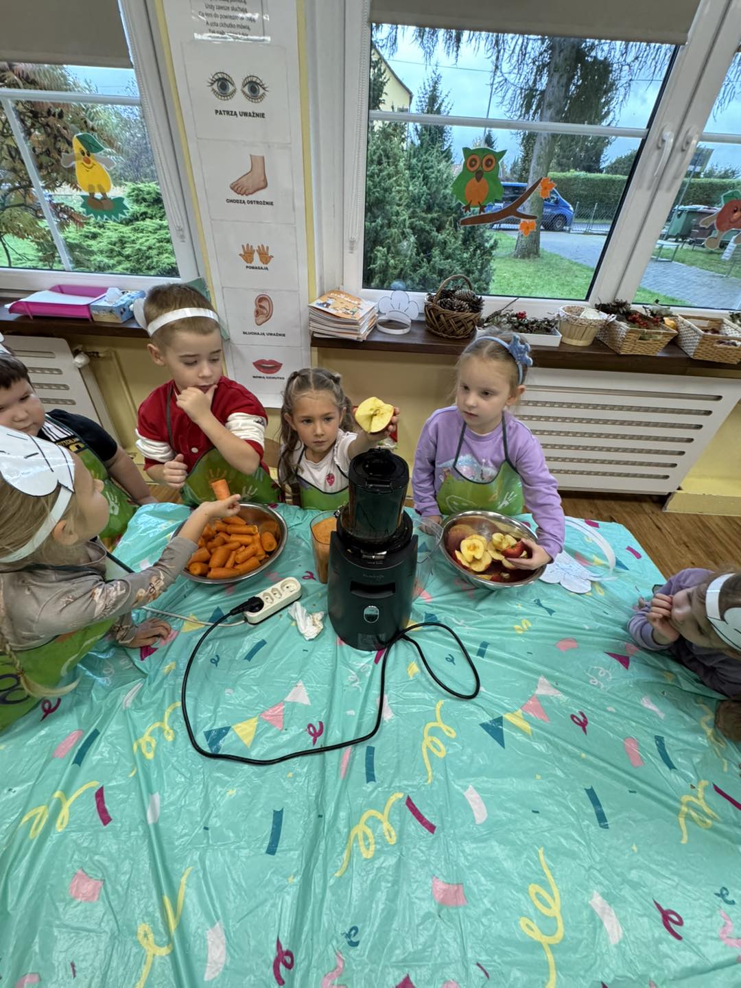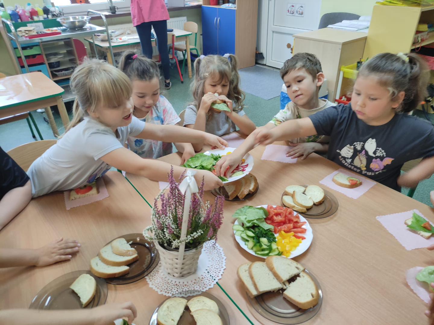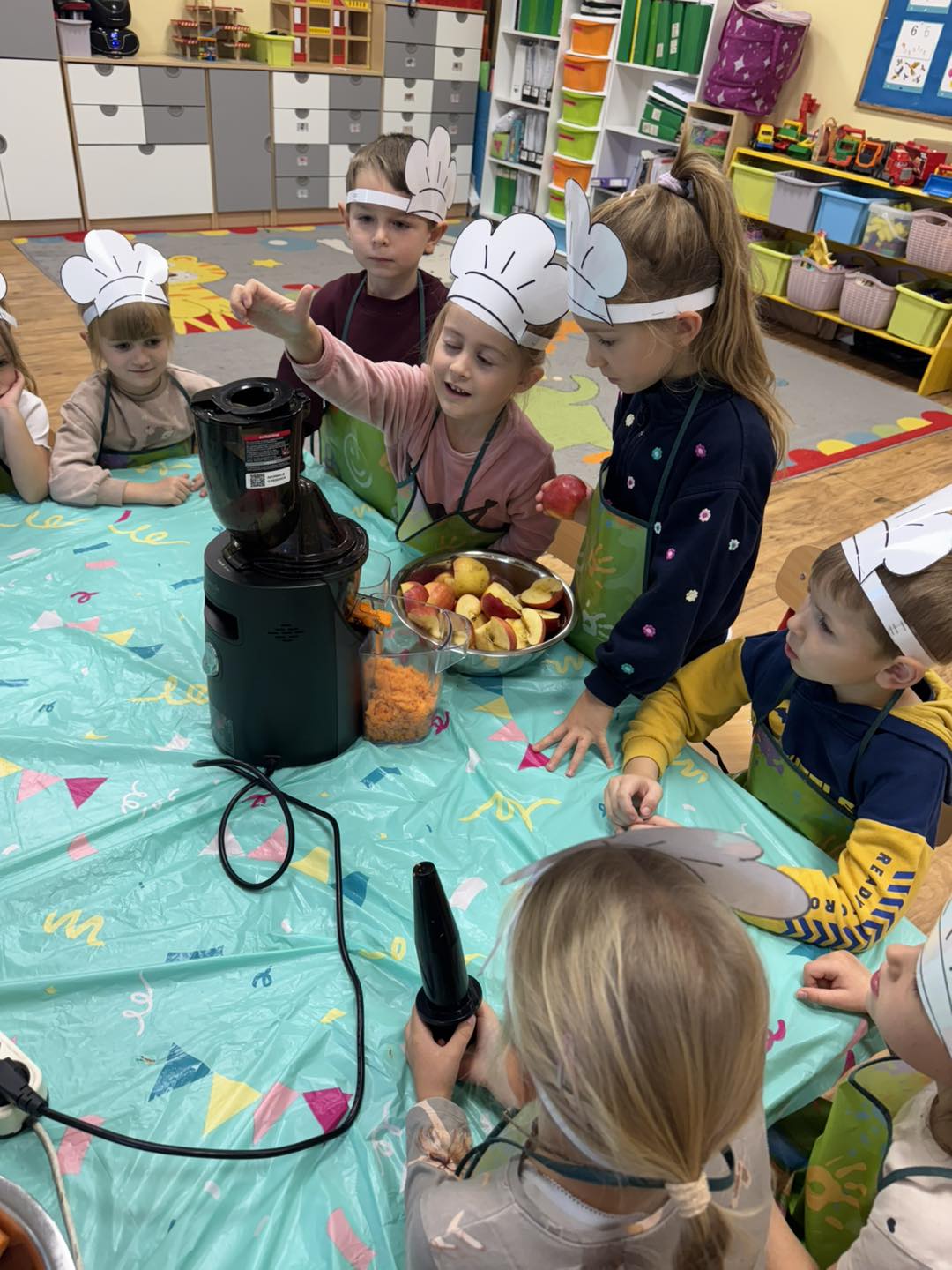 Dzieci 6- letnie wzięły aktywny udział w warsztatach kulinarnych. Samodzielnie komponowały kanapki z warzyw według własnego uznania. Były kolorowe i pyszne! Natomiast 5-latki przygotowały pyszny, zdrowy sok jabłkowo-marchewkowy.