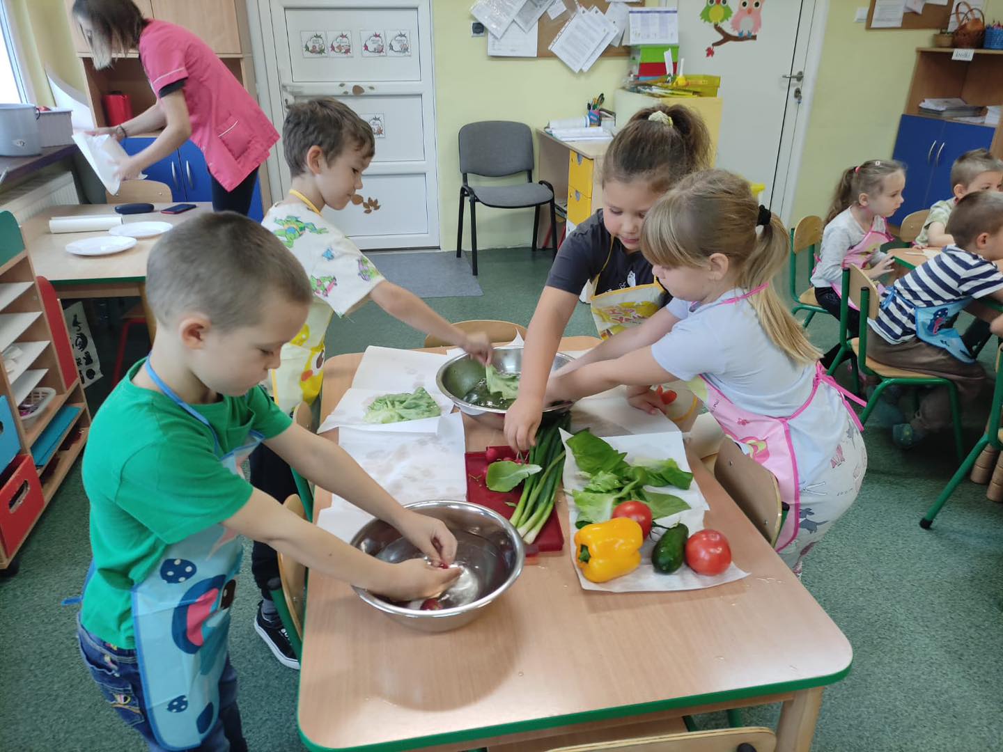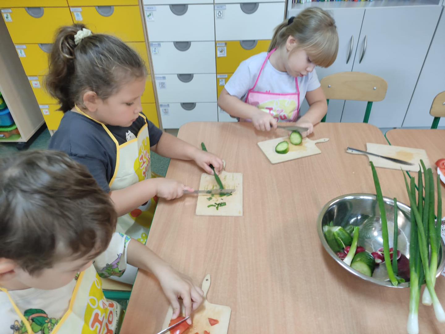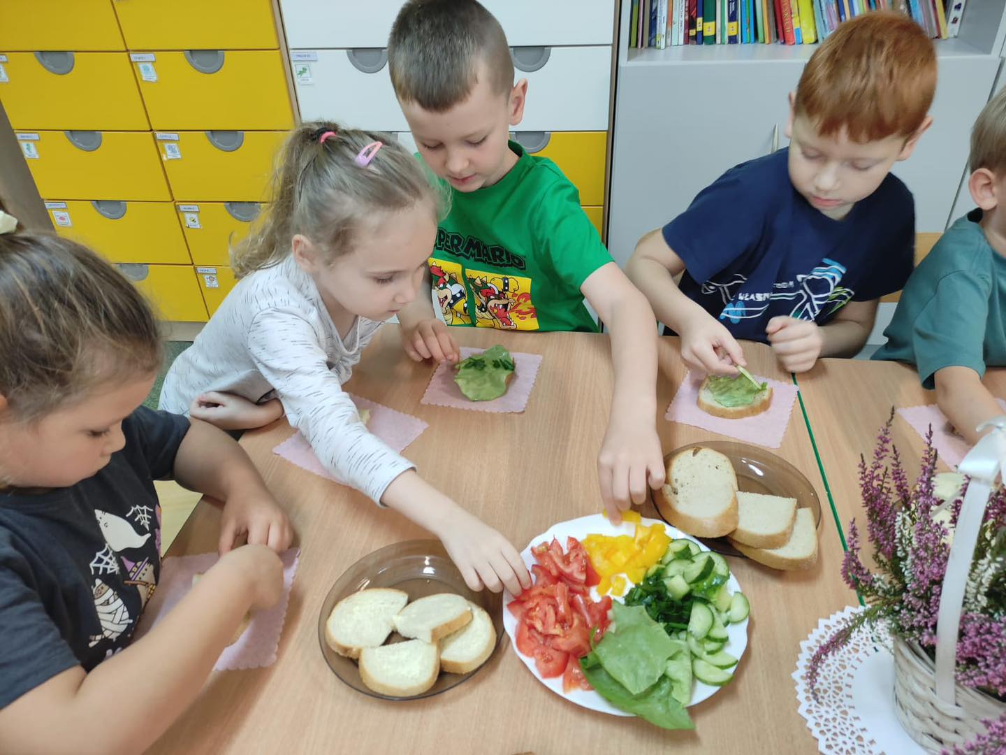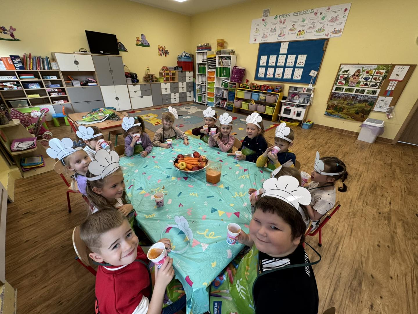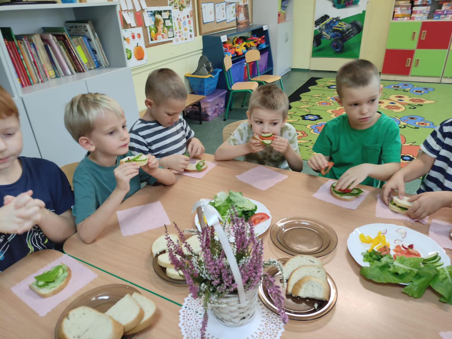 Dzieci 6- letnie wzięły aktywny udział w warsztatach kulinarnych. Samodzielnie komponowały kanapki z warzyw według własnego uznania. Były kolorowe i pyszne! Natomiast 5-latki przygotowały pyszny, zdrowy sok jabłkowo-marchewkowy.
