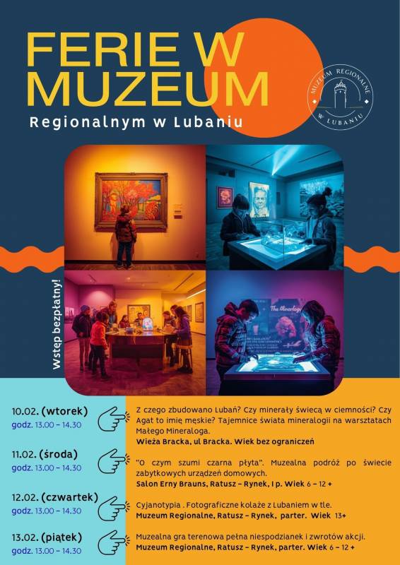 Zapraszamy na rodzinne ferie do Muzeum Regionalne w Lubaniu od wtorku 10.02 do piątku 13.02. Będziemy spotykać się w lubańskim Ratuszu lub Wieży Brackiej w godzinach 13:00 - 14:30 według poniższego harmonogramu.