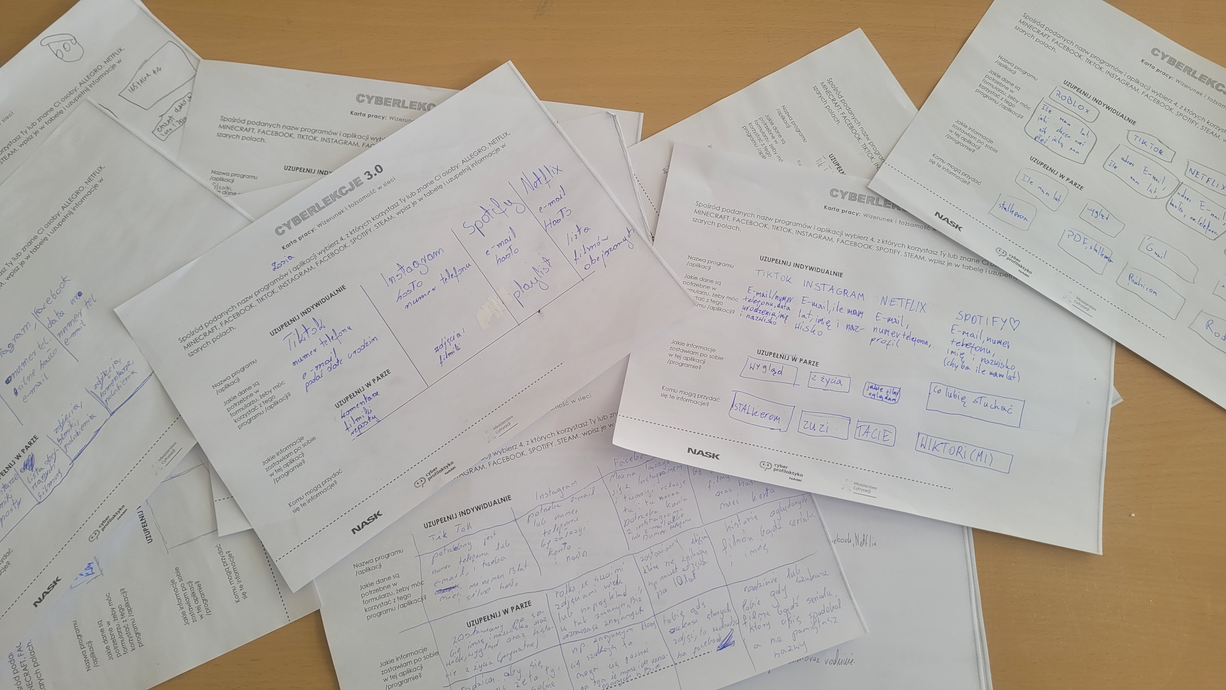 Podczas zajęć uczniowie pracowali również z kartą pracy „Wizerunek i tożsamość w sieci”. Ich zadaniem było wybranie czterech programów lub aplikacji, z których korzystają oni sami lub osoby z ich otoczenia (np. Allegro, Netflix, Minecraft, Facebook, TikTok, Instagram, Spotify, Steam). Następnie wpisywali je do tabeli i uzupełniali informacje dotyczące m.in. tego, jakie dane mogą być w tych aplikacjach udostępniane oraz w jaki sposób użytkownicy tworzą w nich swój wizerunek i tożsamość w sieci.