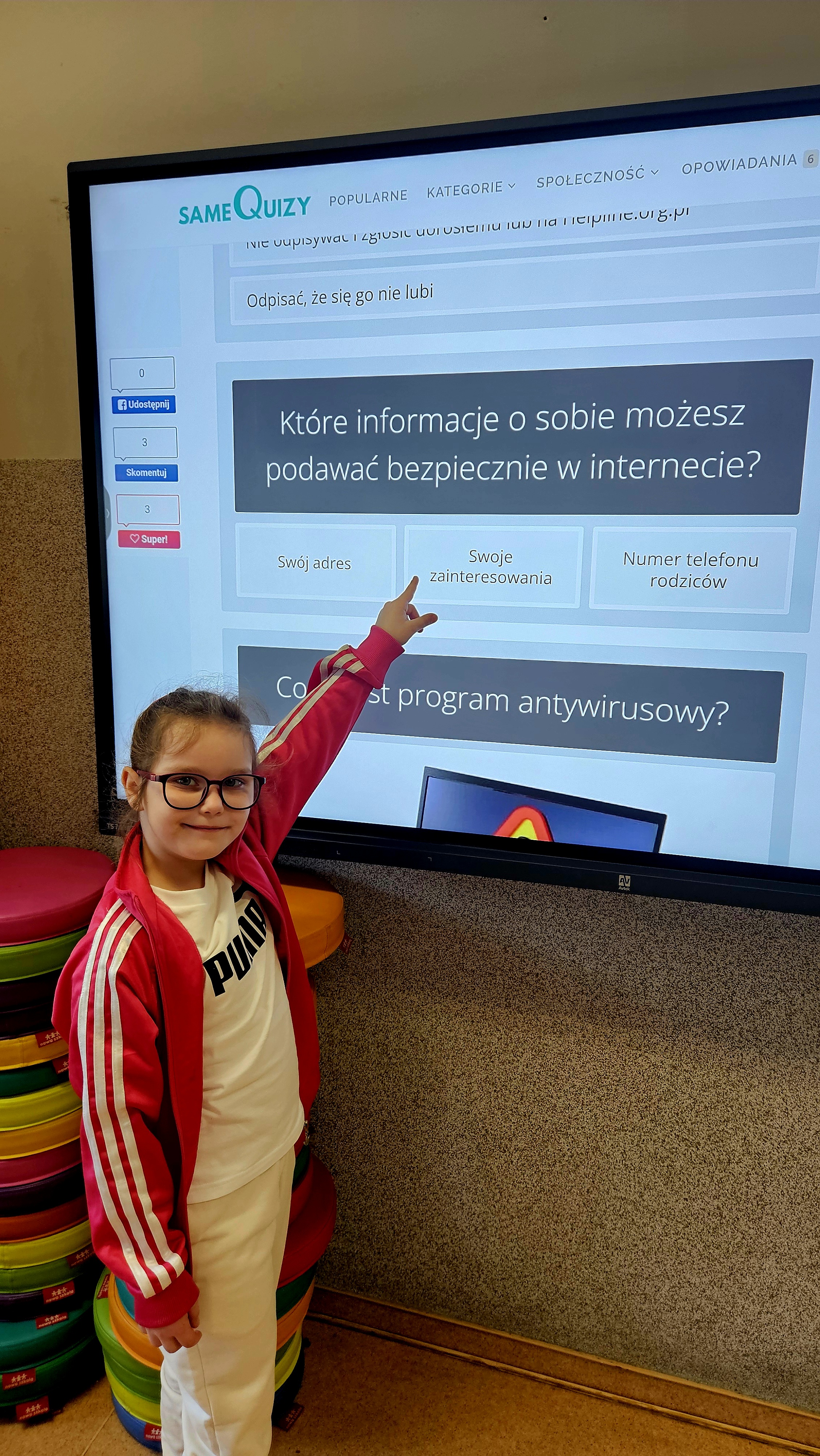 Kolejnym zadaniem była gra „Bezpieczne czy nie?”. Nauczyciel przedstawiał różne sytuacje związane z korzystaniem z internetu, np. prośbę o hasło do gry czy rozmowę z nieznajomym na czacie. Uczniowie decydowali, czy dana sytuacja jest bezpieczna, podnosząc odpowiednie kartki i uzasadniając swój wybór. Starsze klasy uczestniczyły także w quizie wiedzy o RODO, podczas którego sprawdzały swoją wiedzę na temat ochrony danych osobowych, praw użytkowników oraz roli administratora danych.