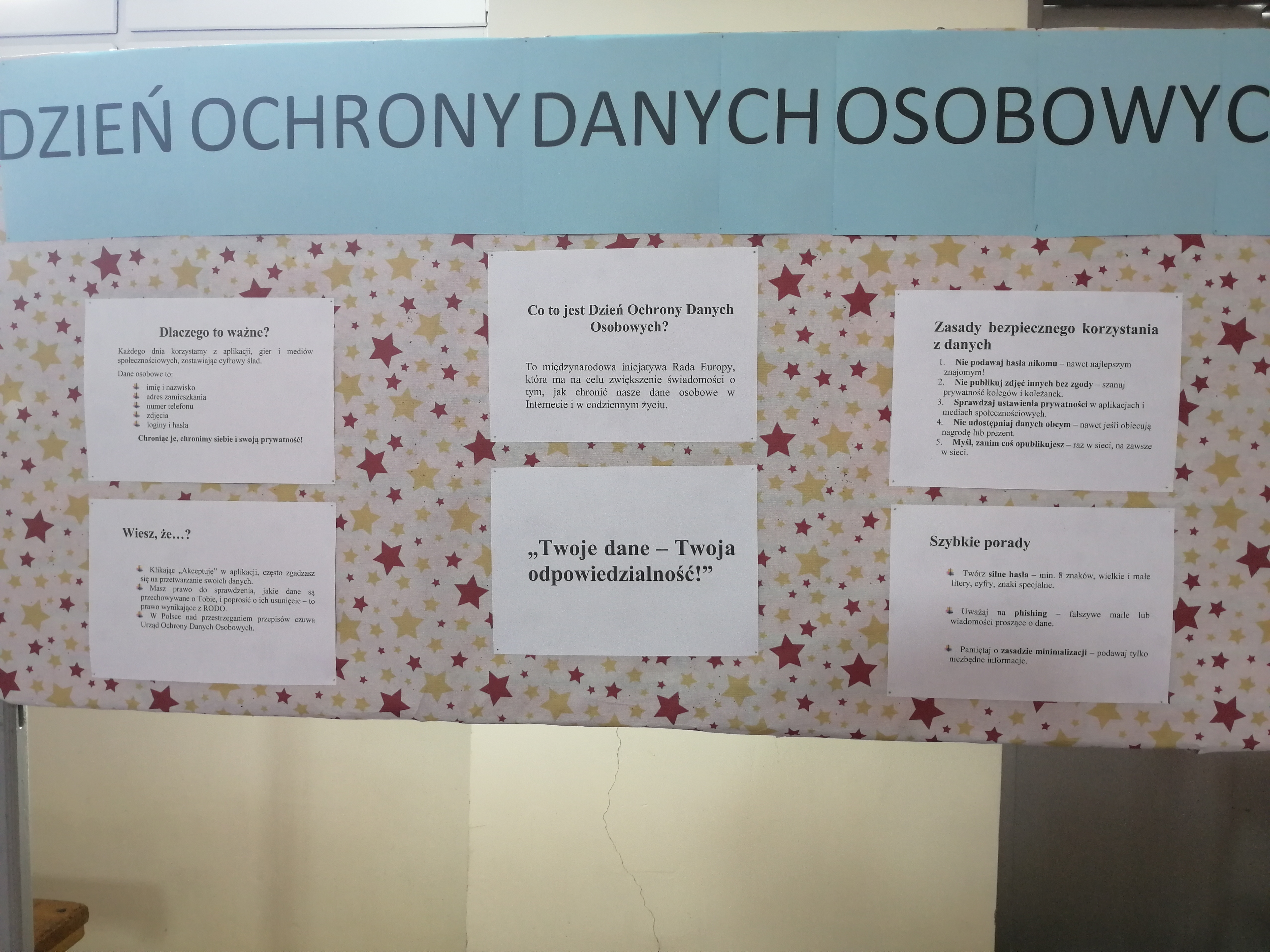 Dodatkowo uczniowie przygotowali plakaty „Chroń swoje dane!”, na których przedstawili hasła oraz zasady bezpiecznego udostępniania informacji w sieci. Prace zostały zaprezentowane na szkolnym korytarzu, tworząc ciekawą i edukacyjną wystawę.