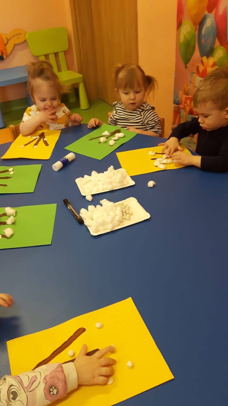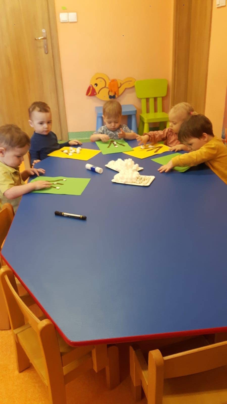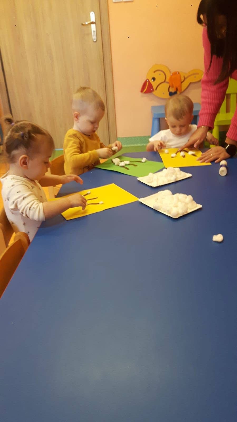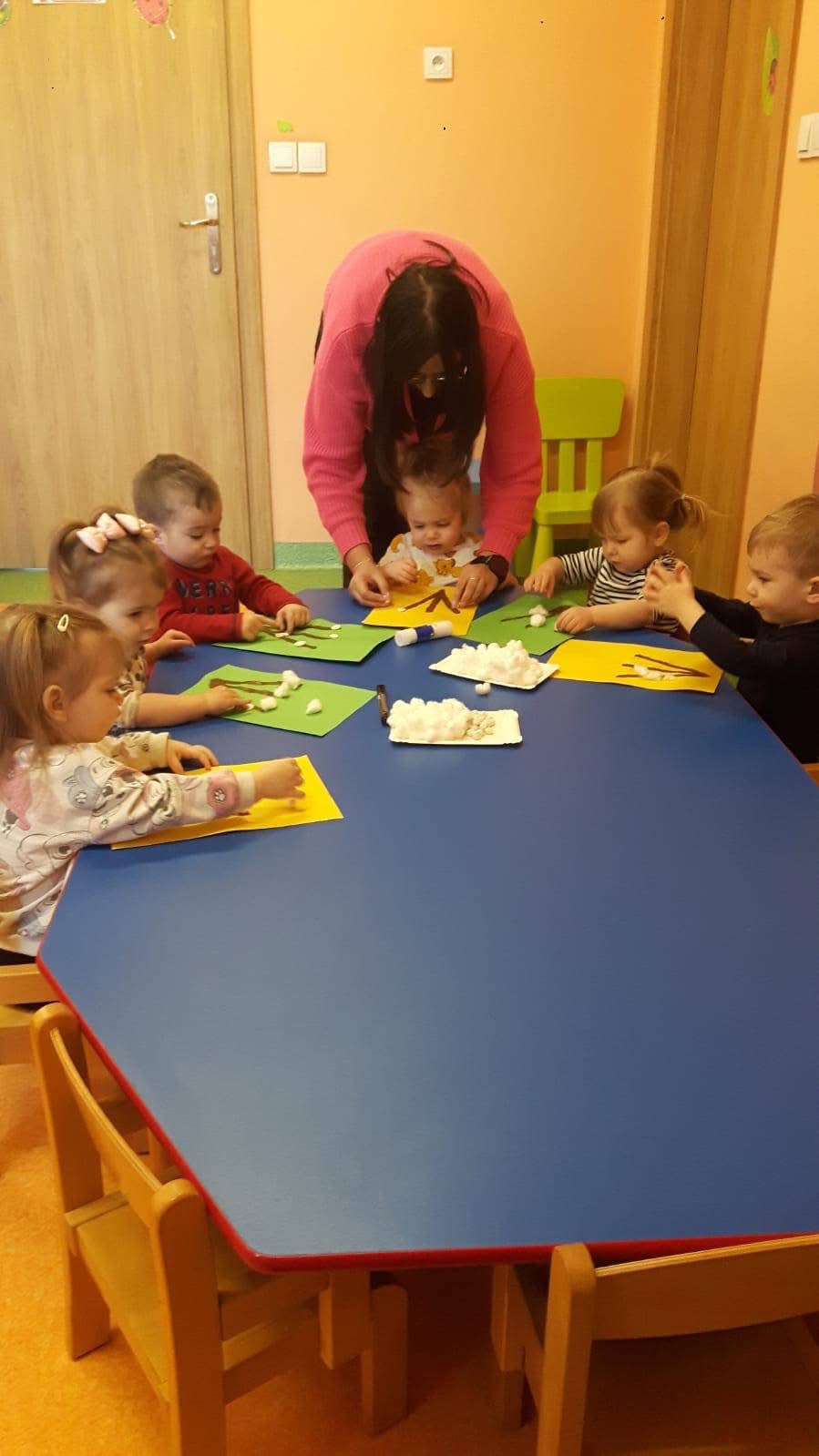 Biedroneczki wykonywały wiosenne bazie - pierwszy zwiastun wiosny. Wyklejały bazie na kartce, rozwijając sprawność manualną, koordynację wzrokowo- ruchową. Symulowały zmysł dotyku i budowały zainteresowanie przyrodą.