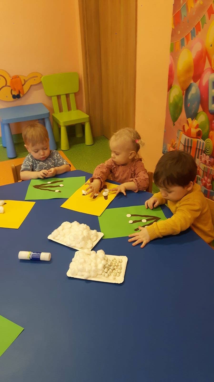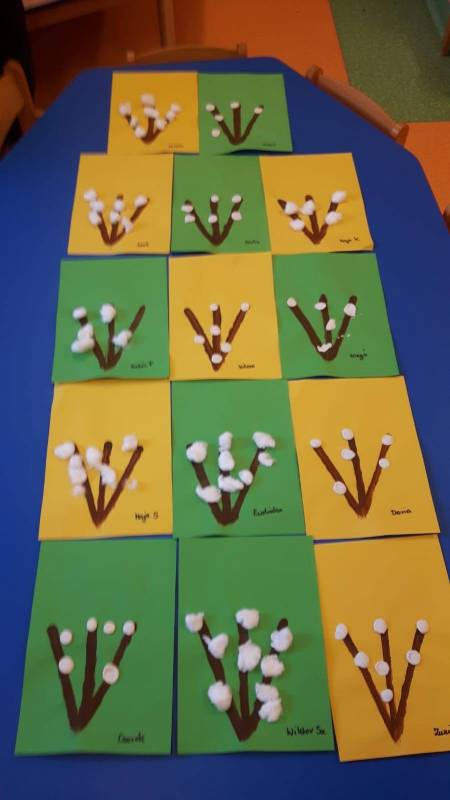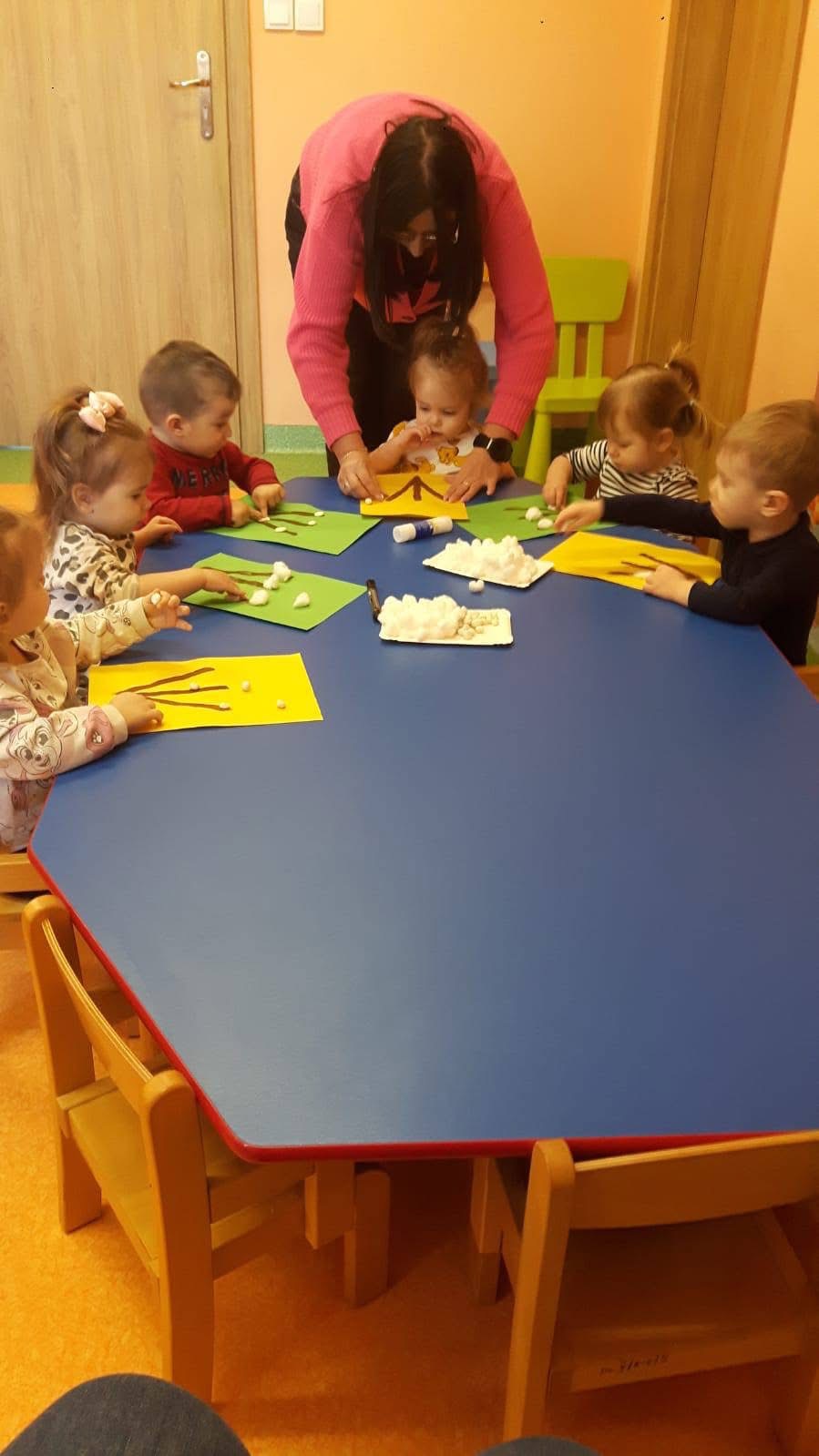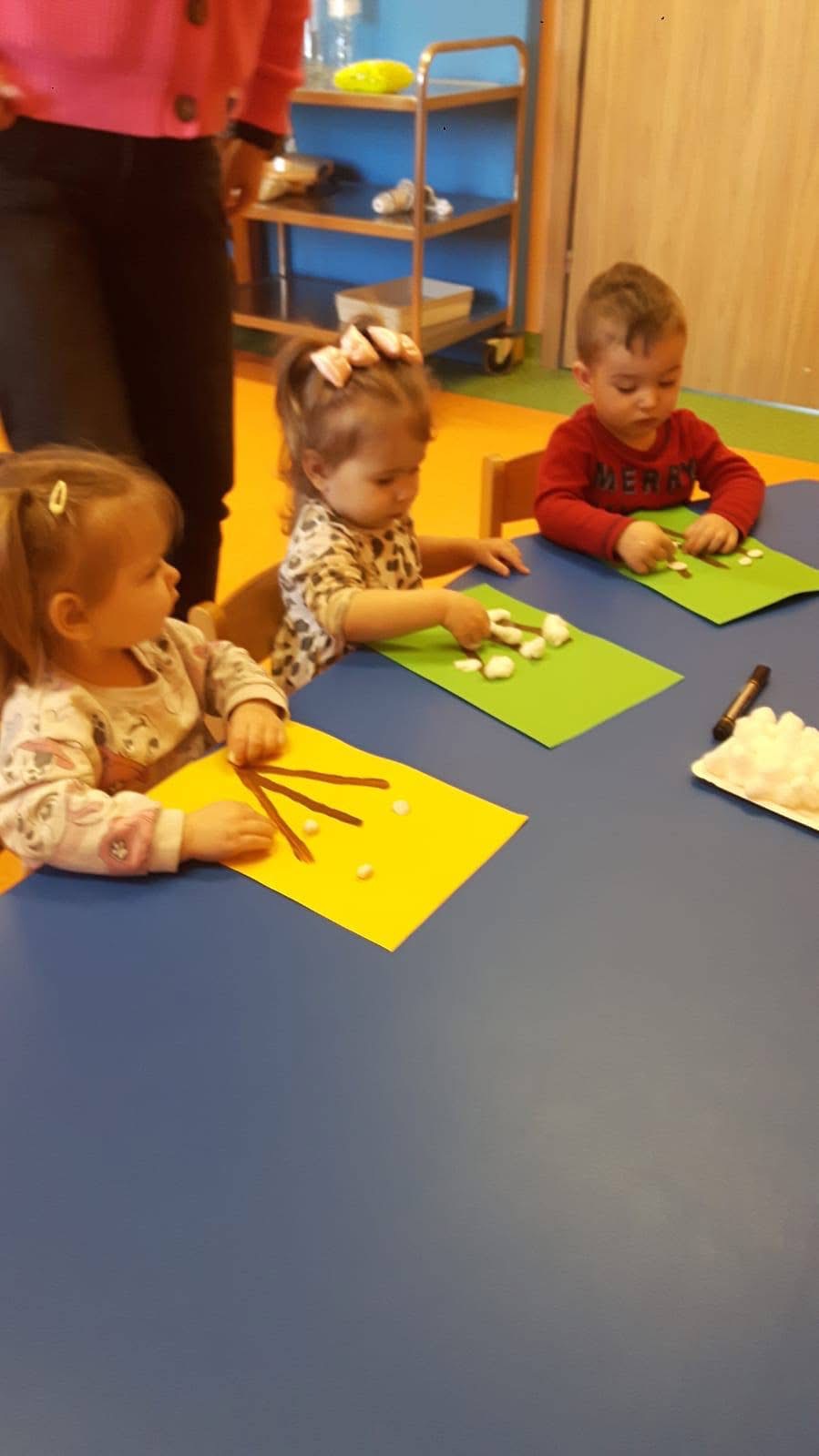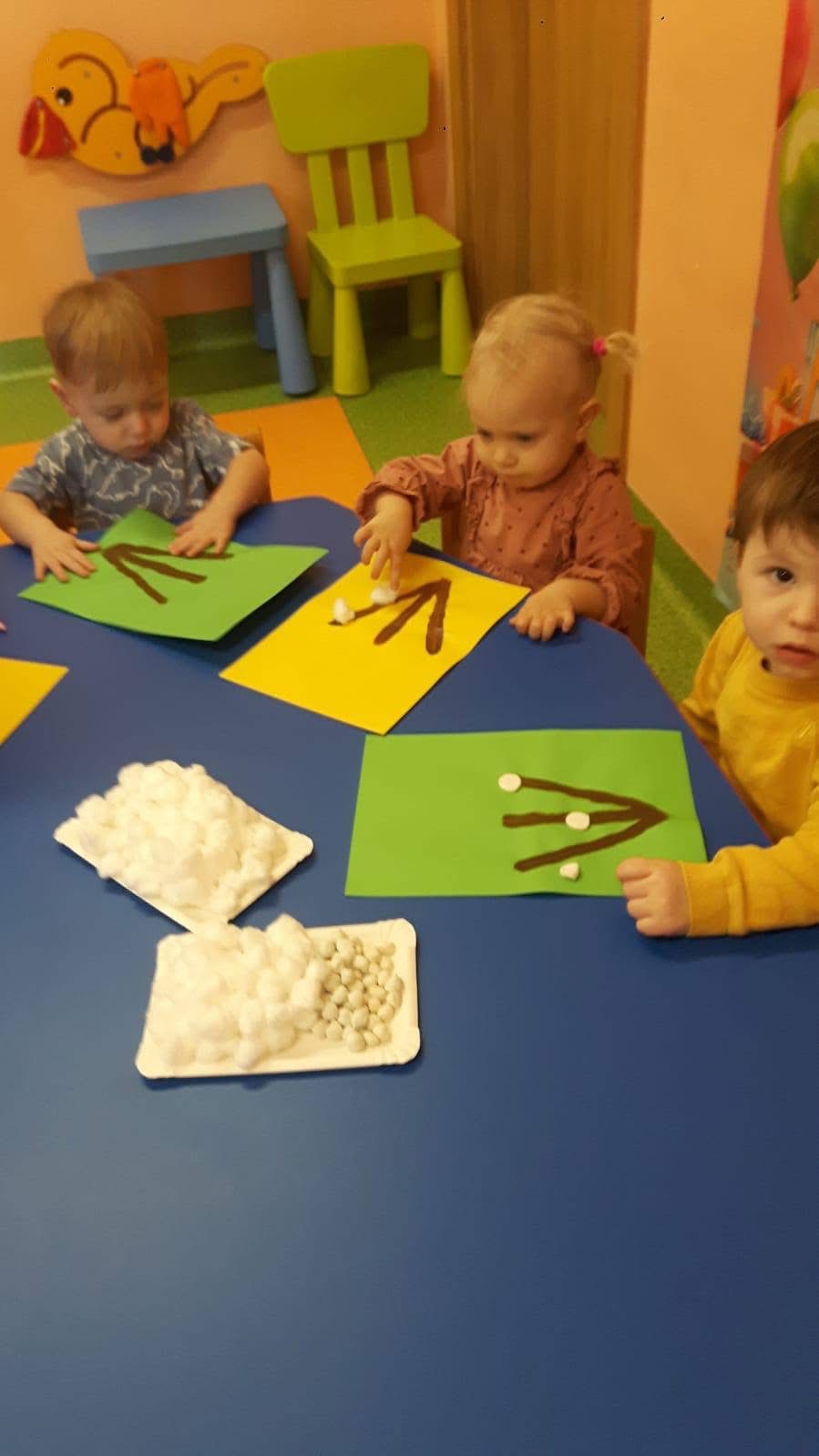 Biedroneczki wykonywały wiosenne bazie - pierwszy zwiastun wiosny. Wyklejały bazie na kartce, rozwijając sprawność manualną, koordynację wzrokowo- ruchową. Symulowały zmysł dotyku i budowały zainteresowanie przyrodą.