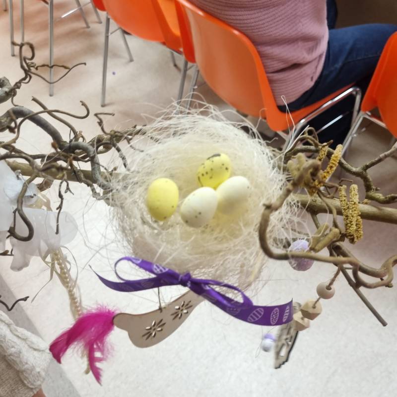 Międzypokoleniowa współpraca podczas warsztatów wiosennych zaowocowała przepięknymi dekoracjami, które ozdobią nasze domy.