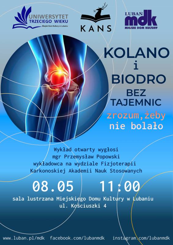 Miejski Dom Kultury w Lubaniu zaprasza na wyjątkowo interesujący wykład pt. „Kolano i biodro bez tajemnic – zrozum, żeby nie bolało”. Spotkanie odbędzie się 8 maja o godz. 11:00 w sali lustrzanej MDK w Lubaniu, przy ul. Kościuszki 4.