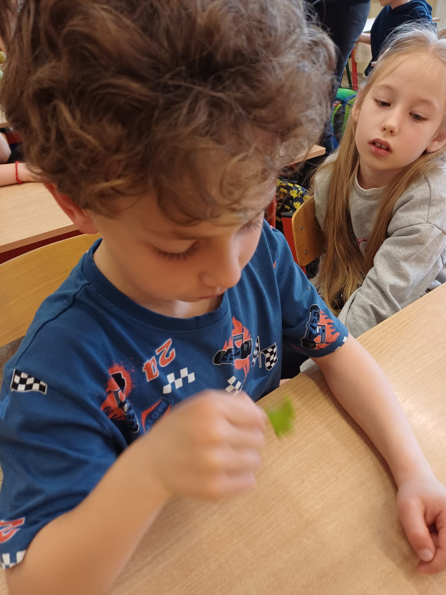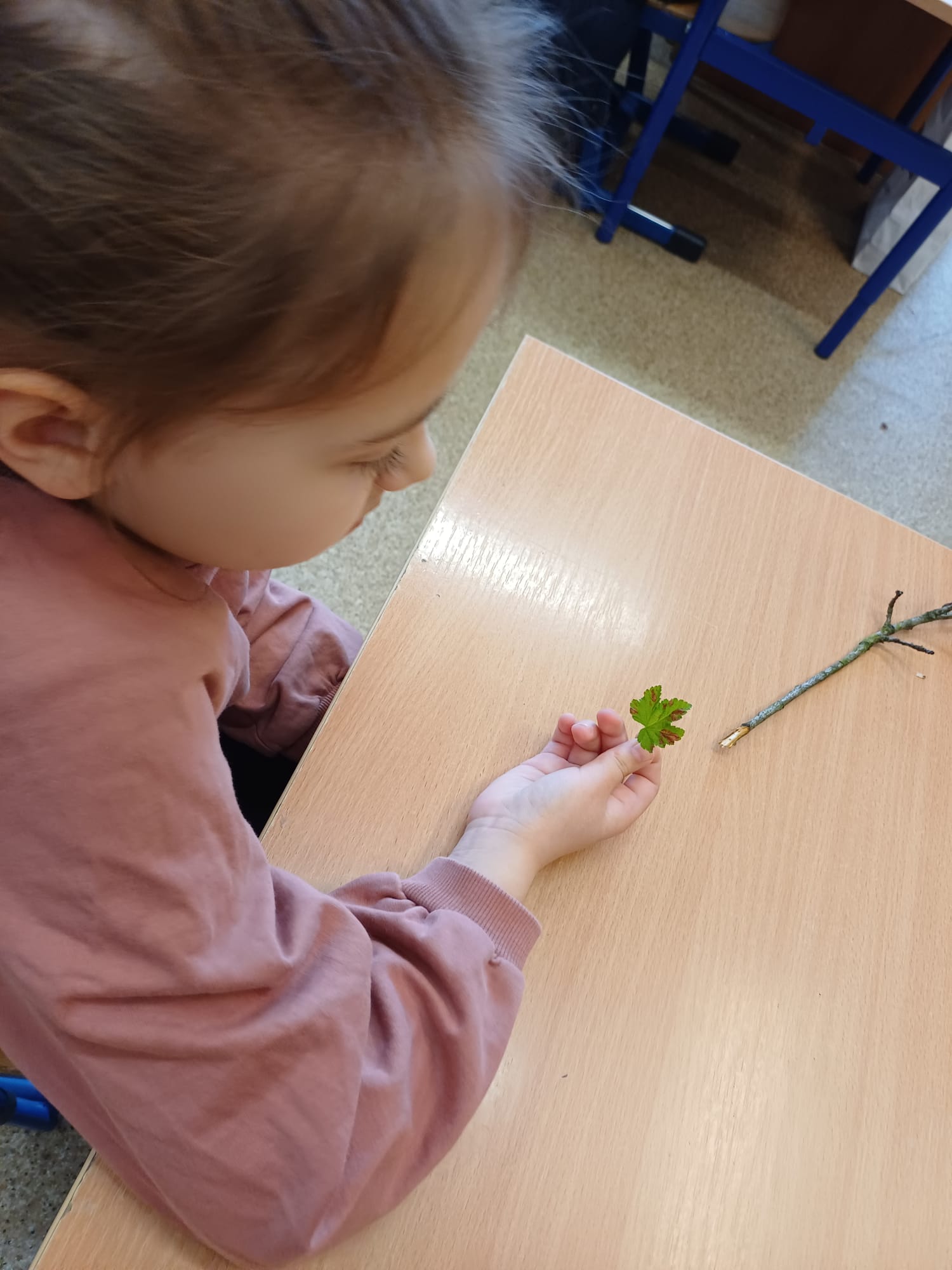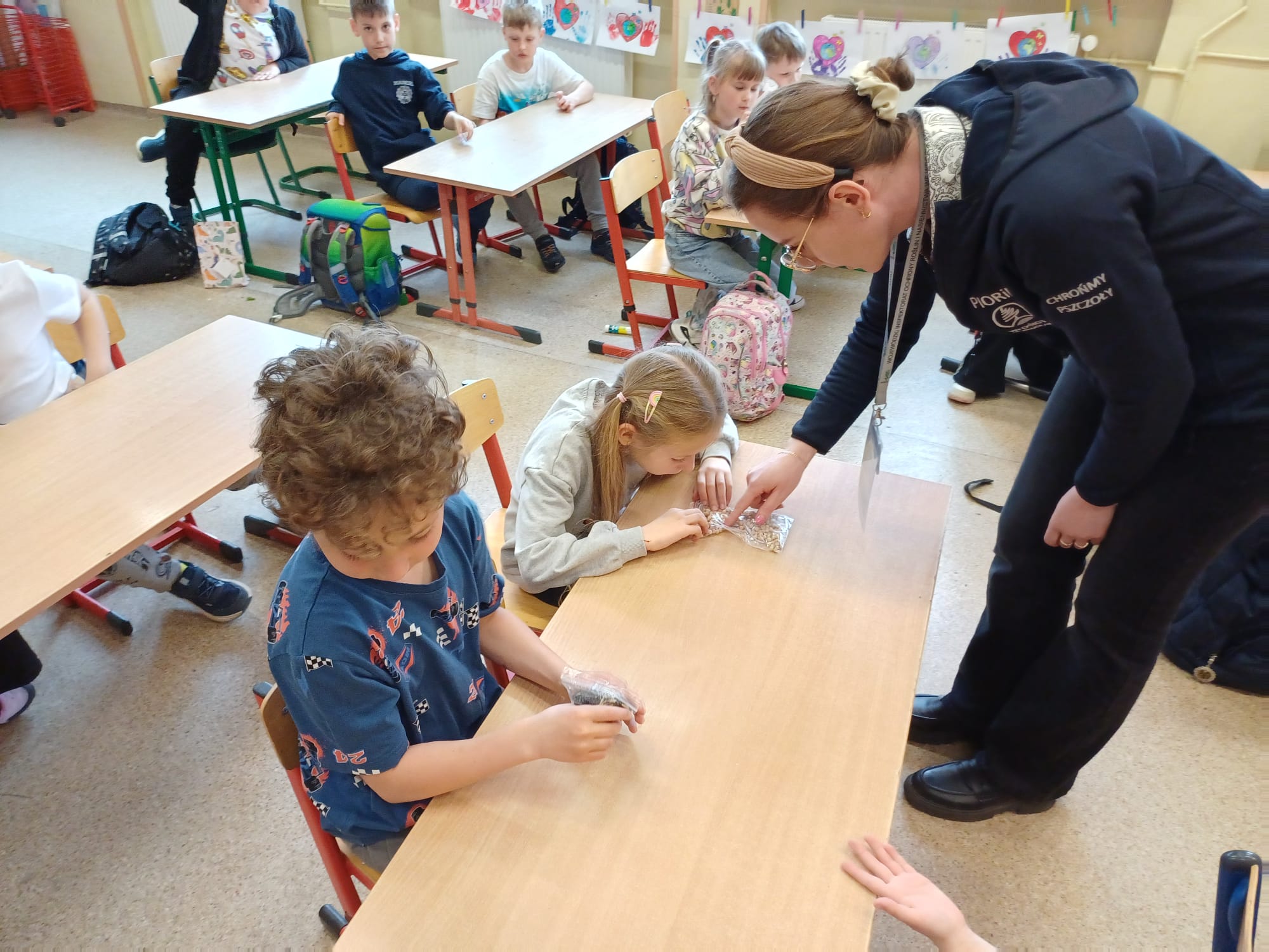 Dzieci porównywały nasiona drzew owocowych (jabłoni, śliwy), rozpoznawały ziarna zbóż oraz rośliny oleiste, takie jak pszenica czy rzepak. Prowadzący zaprezentowali kwitnące pędy wiśni i porzeczki, tłumacząc, jak z kwiatu powstaje owoc. Uczniowie wcielili się także w rolę badaczy, obserwując pod lupą nasiona oraz liście zaatakowane przez szkodniki. To było bardzo inspirujące spotkanie. Dzięki gościom z Inspektoratu pierwszoklasiści zrozumieli, jak wiele trudu i naturalnych procesów wymaga wyhodowanie zdrowego jabłka czy upieczenie chleba.