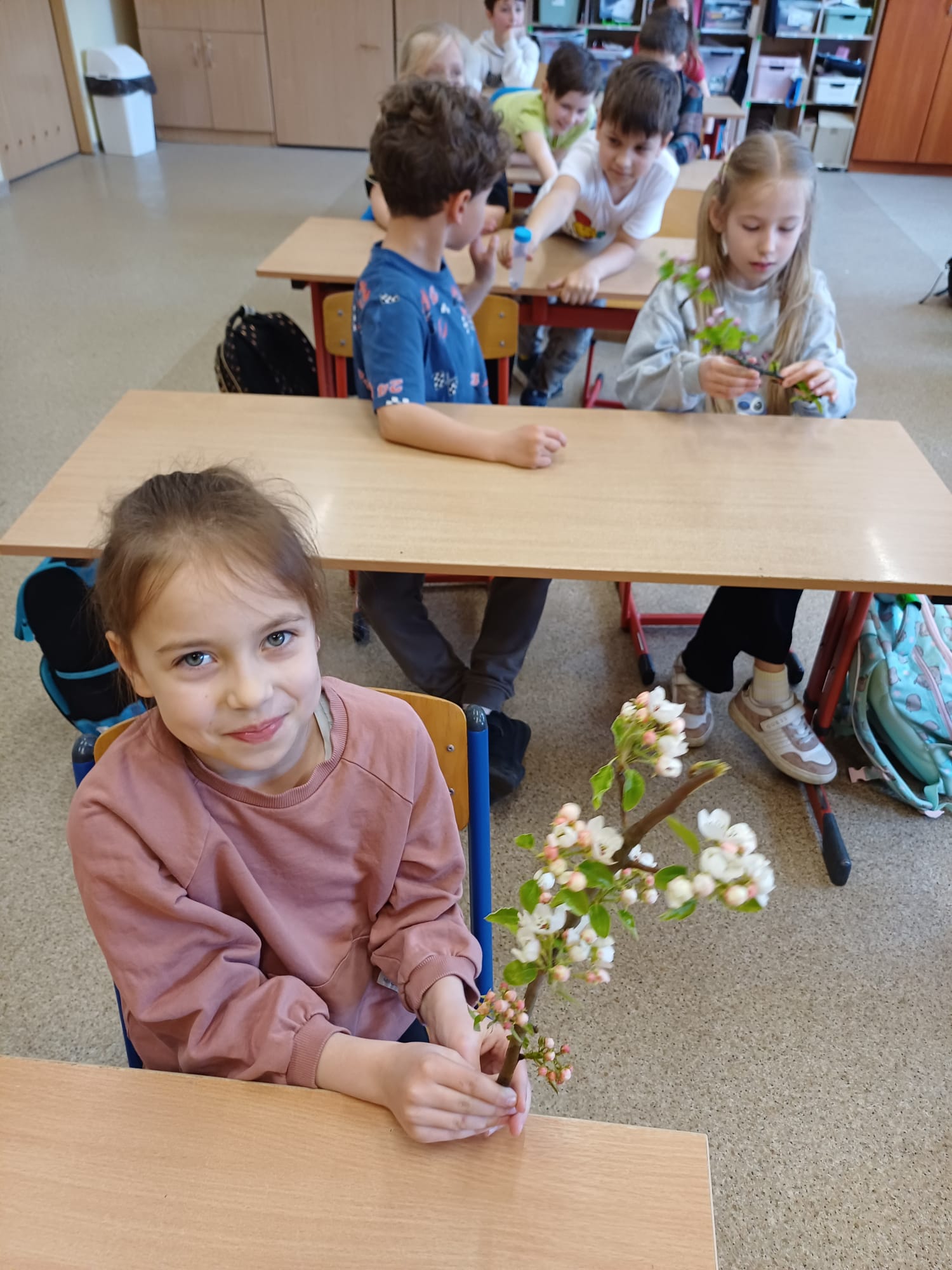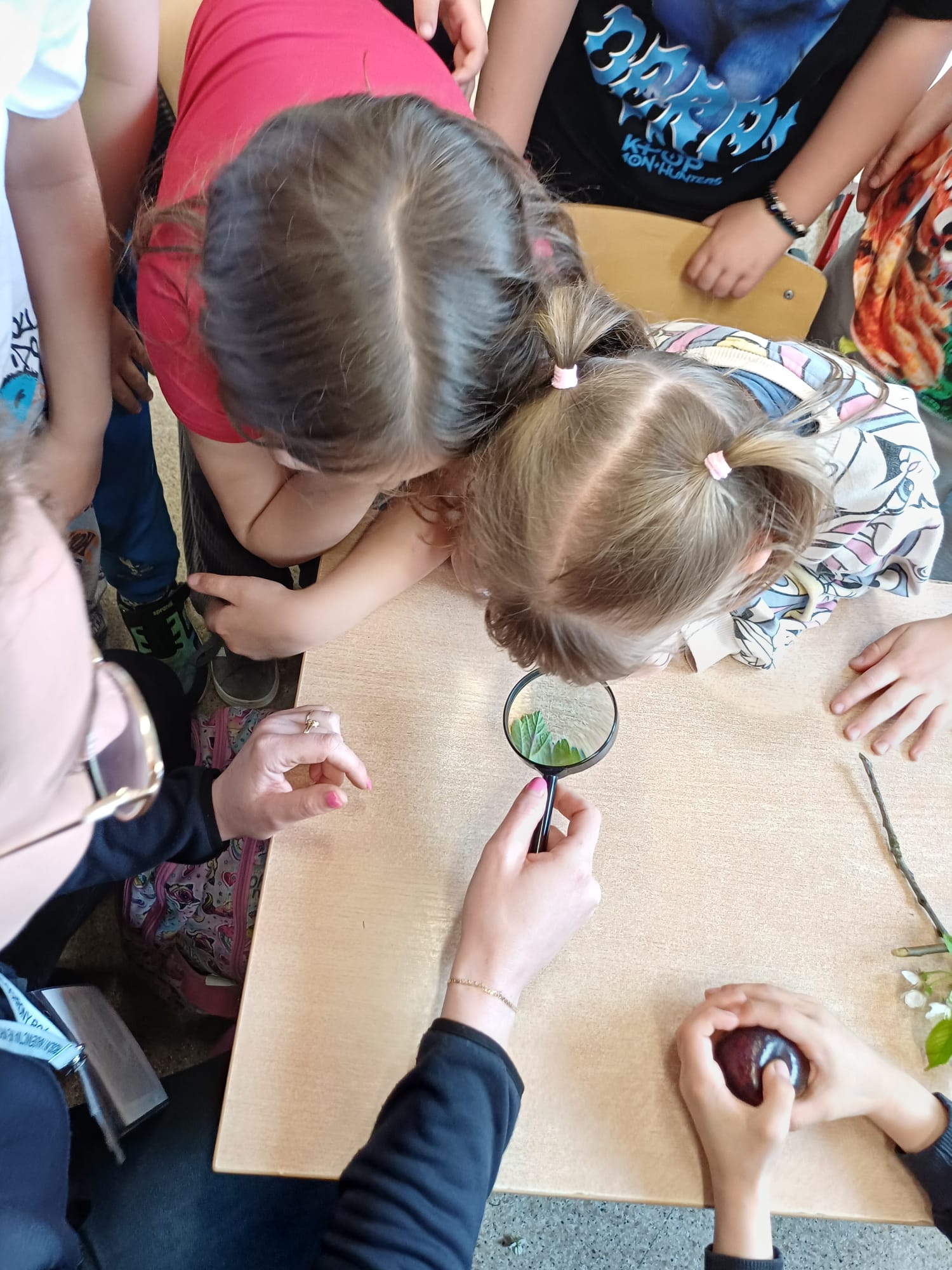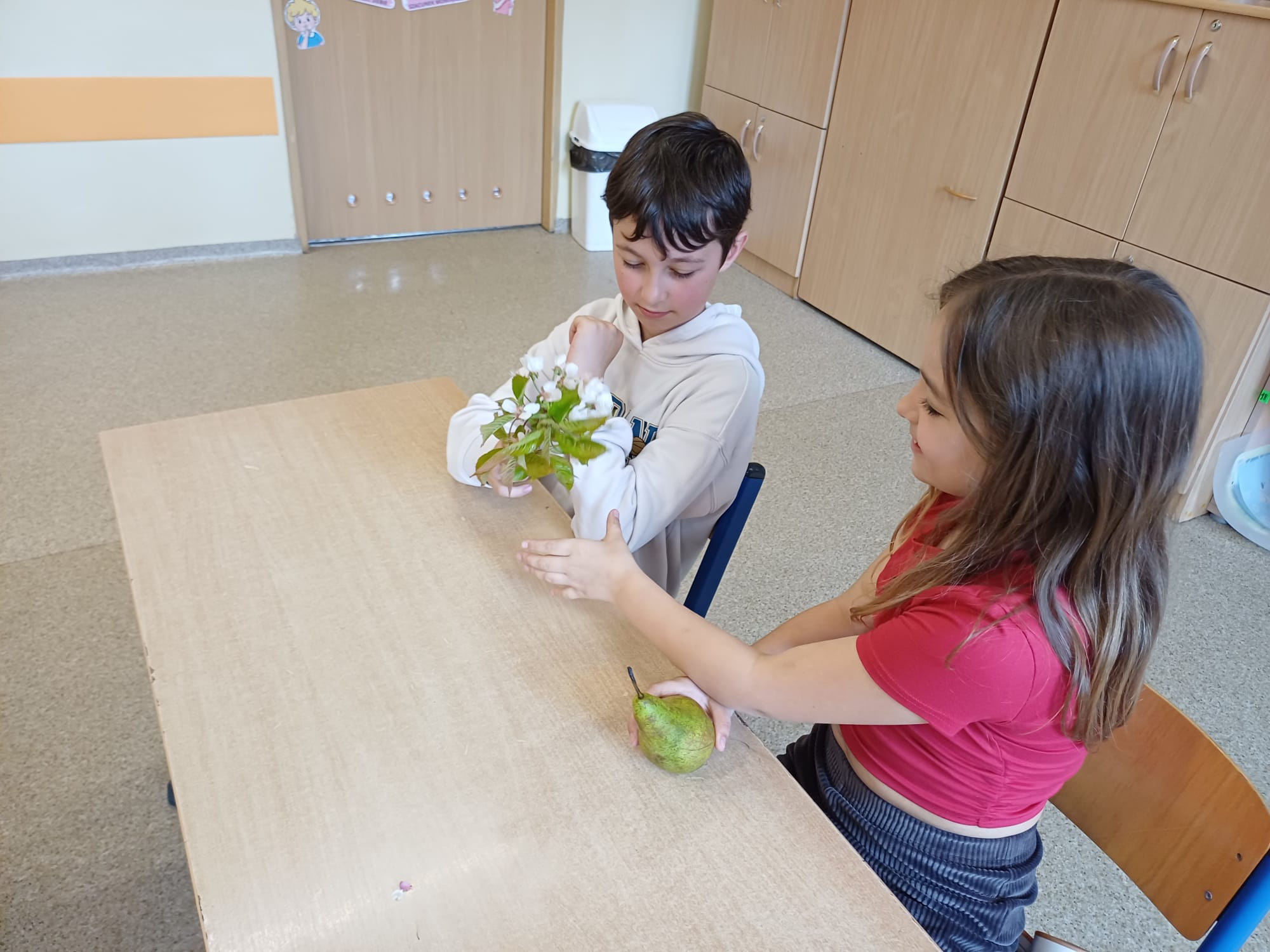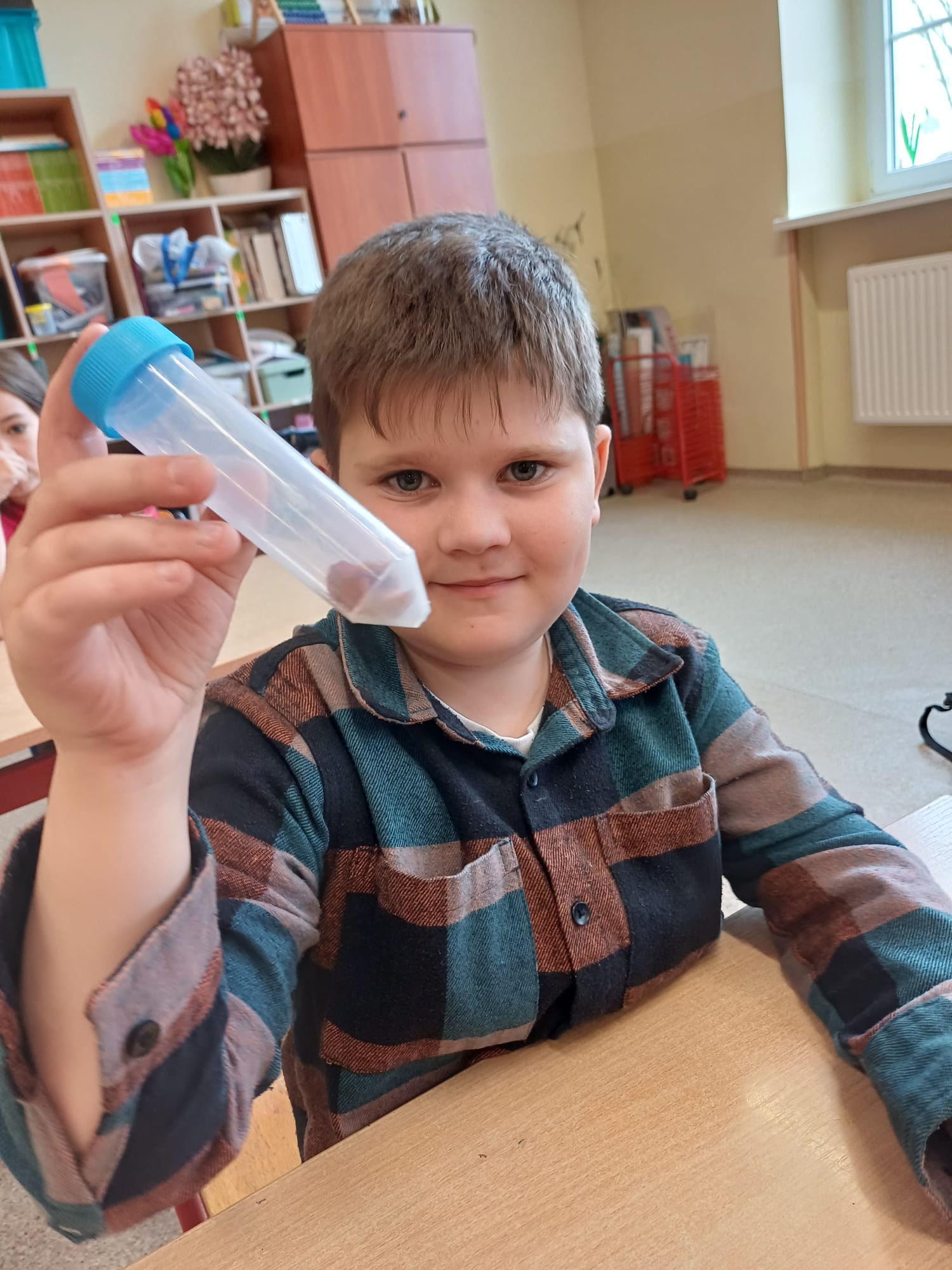 Dzieci porównywały nasiona drzew owocowych (jabłoni, śliwy), rozpoznawały ziarna zbóż oraz rośliny oleiste, takie jak pszenica czy rzepak. Prowadzący zaprezentowali kwitnące pędy wiśni i porzeczki, tłumacząc, jak z kwiatu powstaje owoc. Uczniowie wcielili się także w rolę badaczy, obserwując pod lupą nasiona oraz liście zaatakowane przez szkodniki. To było bardzo inspirujące spotkanie. Dzięki gościom z Inspektoratu pierwszoklasiści zrozumieli, jak wiele trudu i naturalnych procesów wymaga wyhodowanie zdrowego jabłka czy upieczenie chleba.