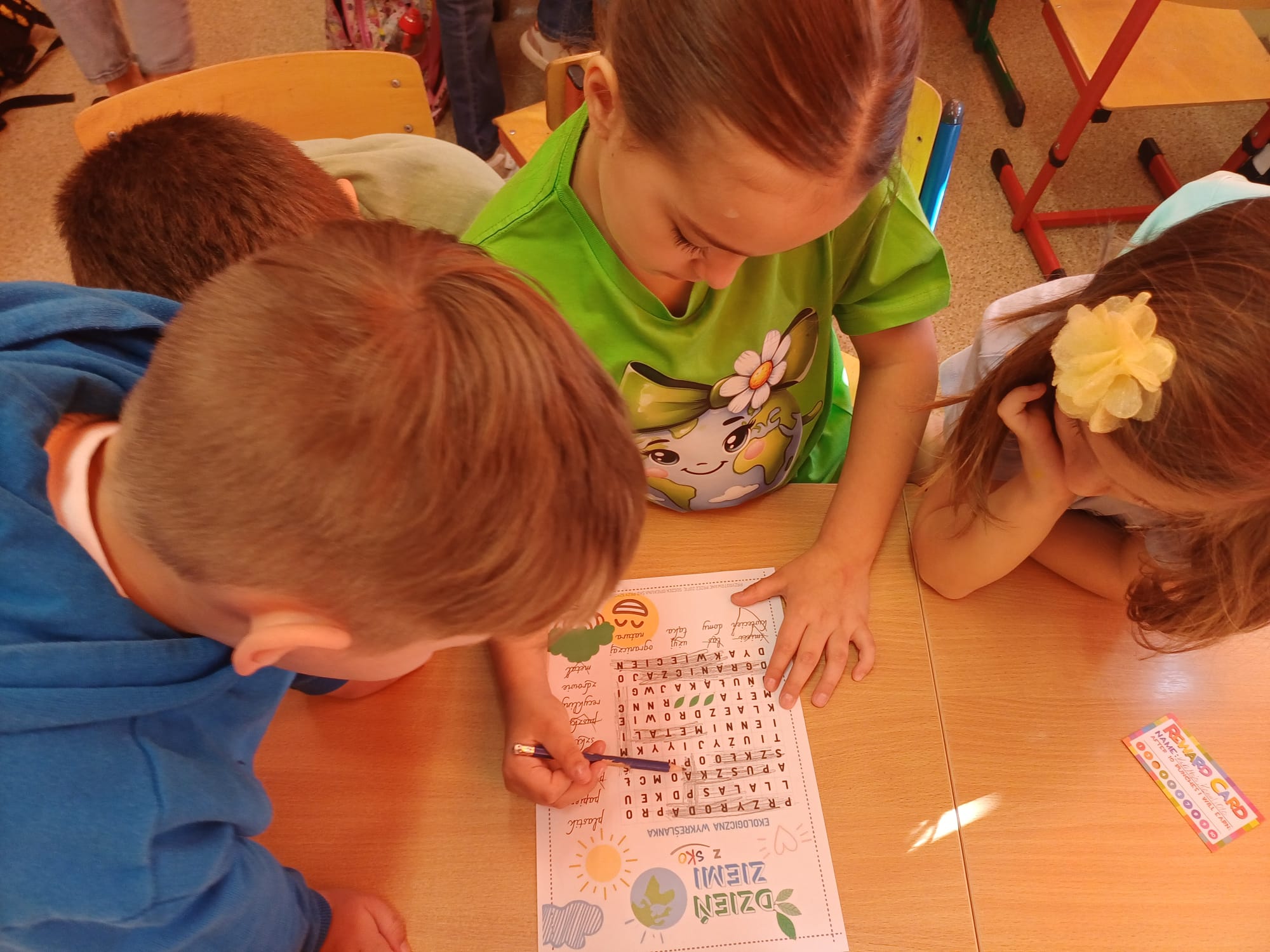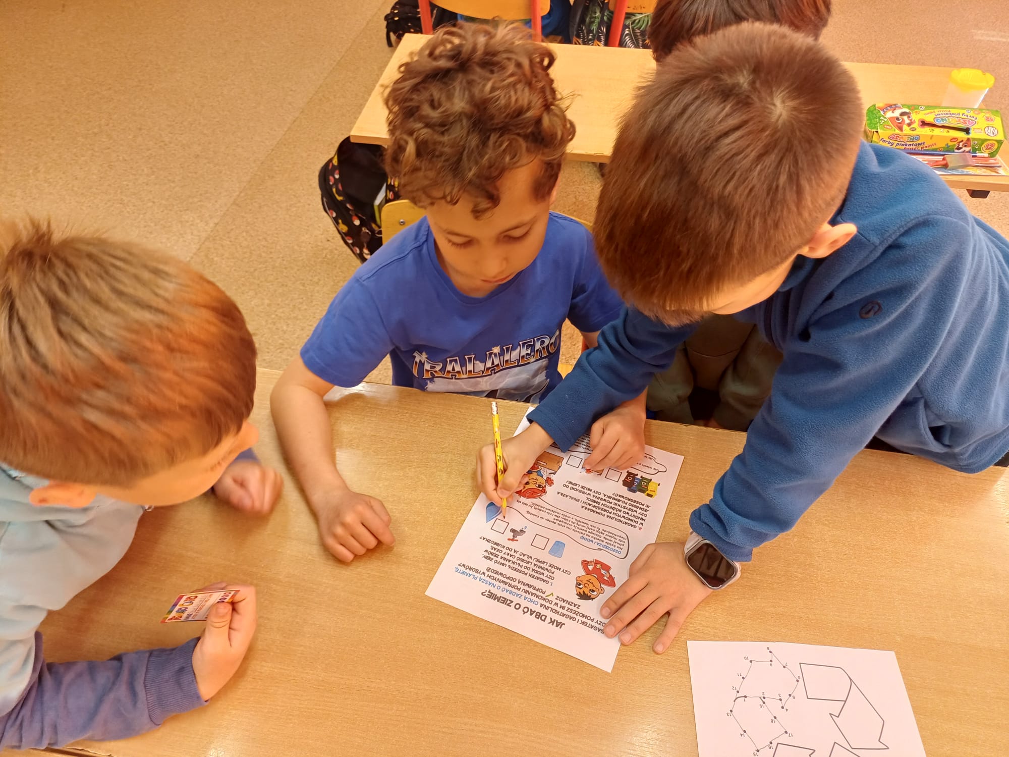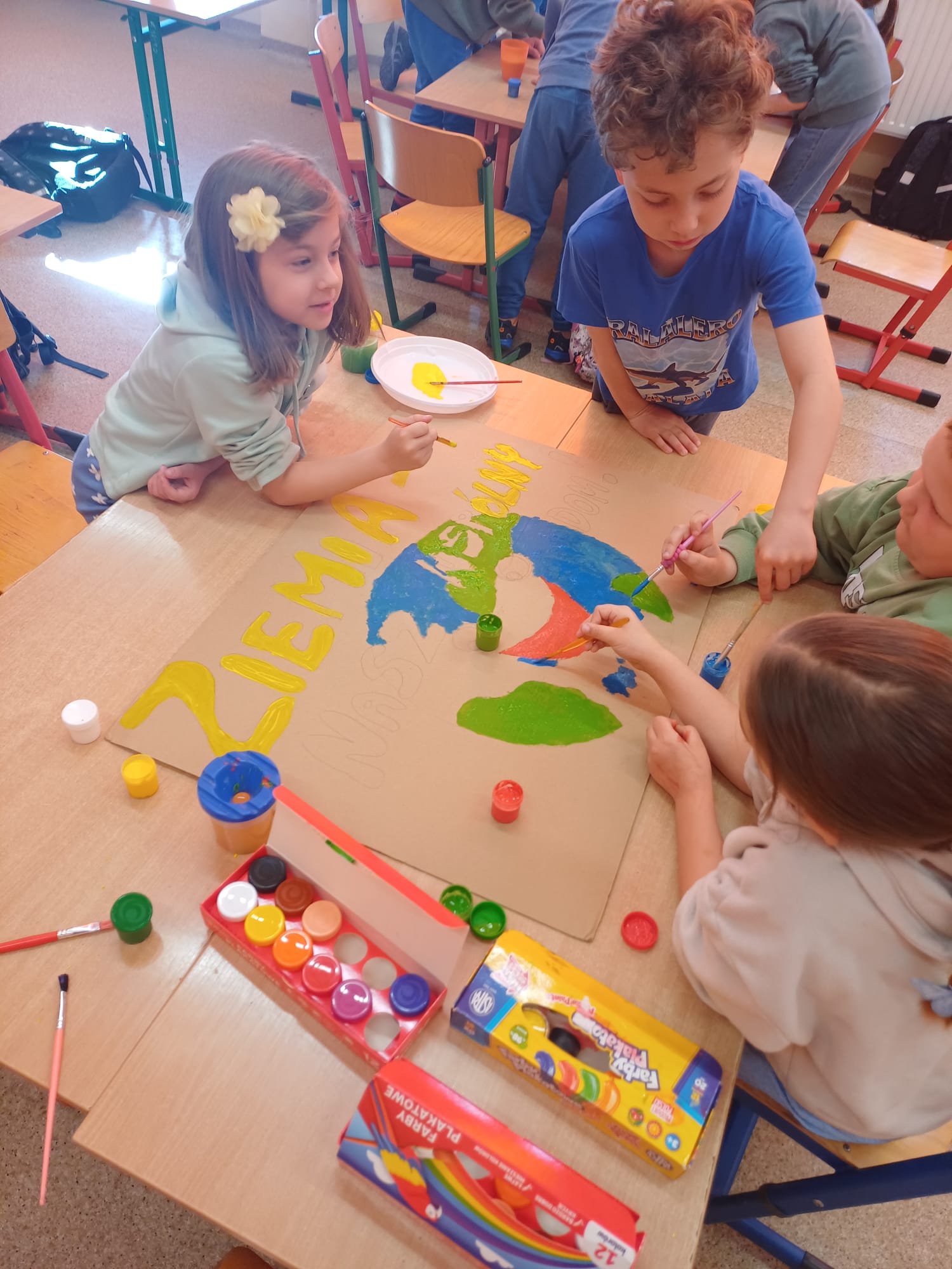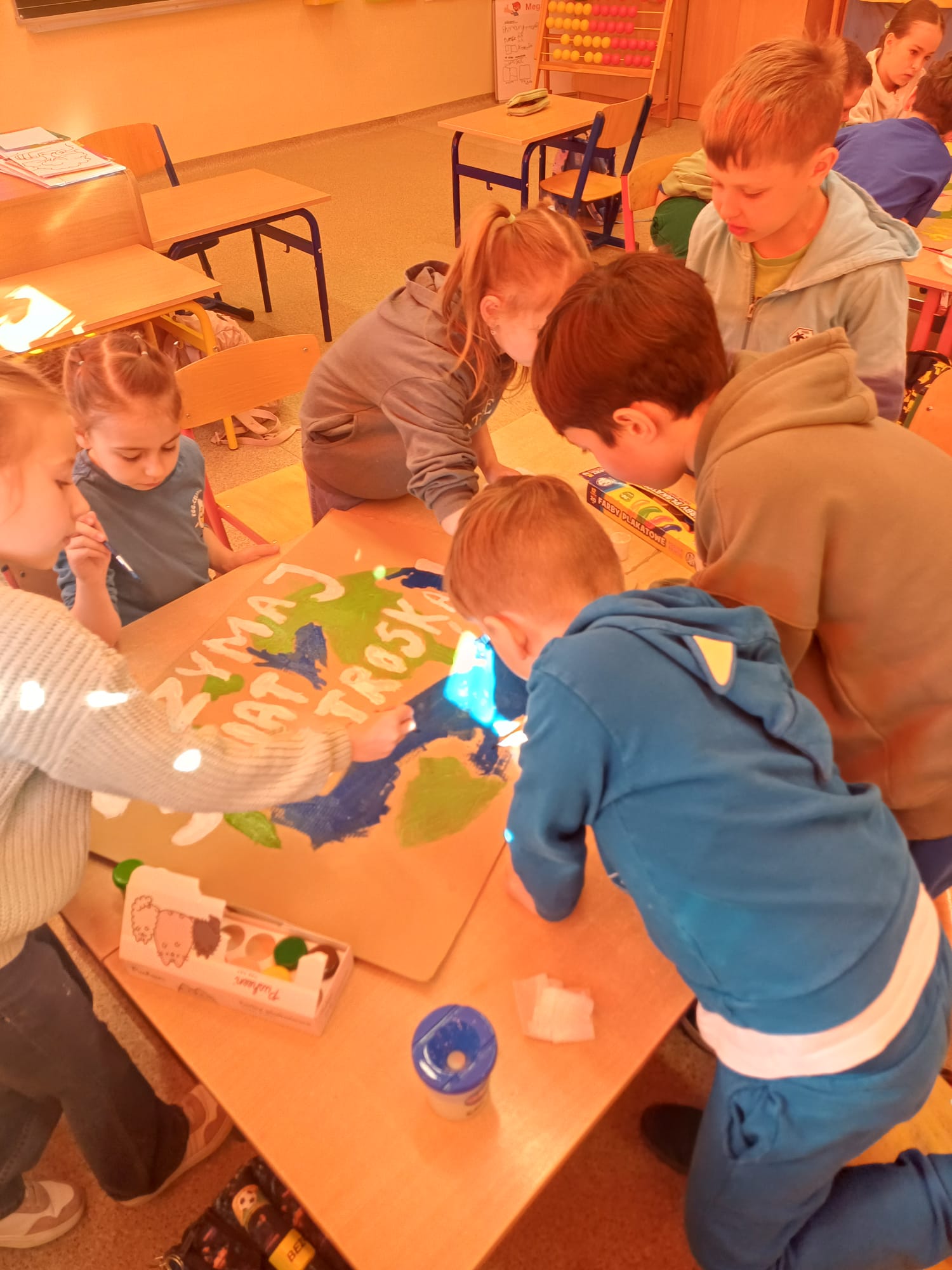 Dzień Ziemi w klasie 1a był pełen ekologicznych emocji i twórczej energii. Uczniowie rozpoczęli obchody od przygotowania barwnych opasek na głowę oraz haseł na autorskie plakaty, by następnie wziąć udział w pasjonującej grze zadaniowej pn. „Jak dbać o Ziemię z Gagatkiem i Gagatkoliną?”. Po solidnej dawce wiedzy i wspólnej zabawie, szkołę wypełniły dźwięki piosenki Majki Jeżowskiej „Moja planeta”, którą dzieci odśpiewały z wielkim zapałem.